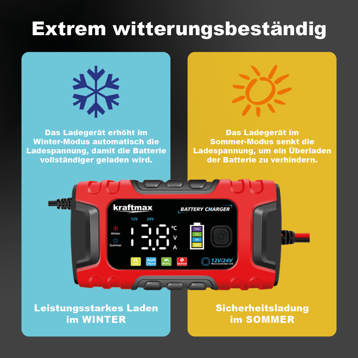 7-Stufiges vollautomatisches Smart-Ladegerät mit LCD-Display, für AGM, Nass, Gel, Blei-Säure und LiFePO4 Batterien/Akkus . Das Kraftmax Batterieladegerät ist ein multifunktionales Ladegerät, das speziell für 12V- und 24V Blei-Säure-Batterien sowie Lifepo4-Batterien entwickelt wurde.