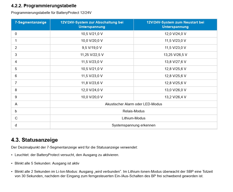 Einfach Programmierung / Einstellung über LED-Display : Der BatteryProtect lässt sich so einstellen, dass sie sich bei mehreren verschiedenen Spannungen ein- bzw. ausschaltet. Die Siebensegmentanzeige gibt dann an, welche Einstellung / Programmierung gewählt wurde. Eine besondere Einstellung für Lithium-Ionen-Batterien In diesem Modus lässt sich der BatteryProtect durch das VE.Bus BMS steuern.
