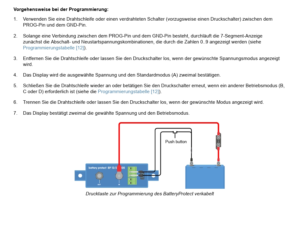 Hinweis: Die BatteryProtect kann auch als Ladungsbrechers zwischen einem Batterieladegerät und einem Li-Ionen-Akku verwendet werden. Siehe Anschlussplan im Handbuch.