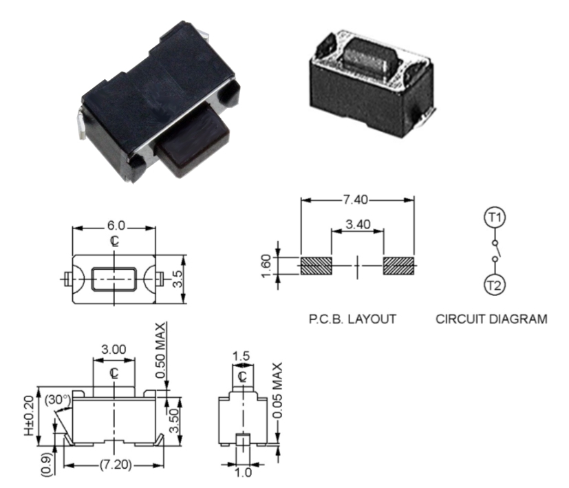 Produktinformationen "SMD Taster Minitaster liegend 6,0x3,5mm Höhe 3,5mm mit Knebel 5mm Platinentaster"