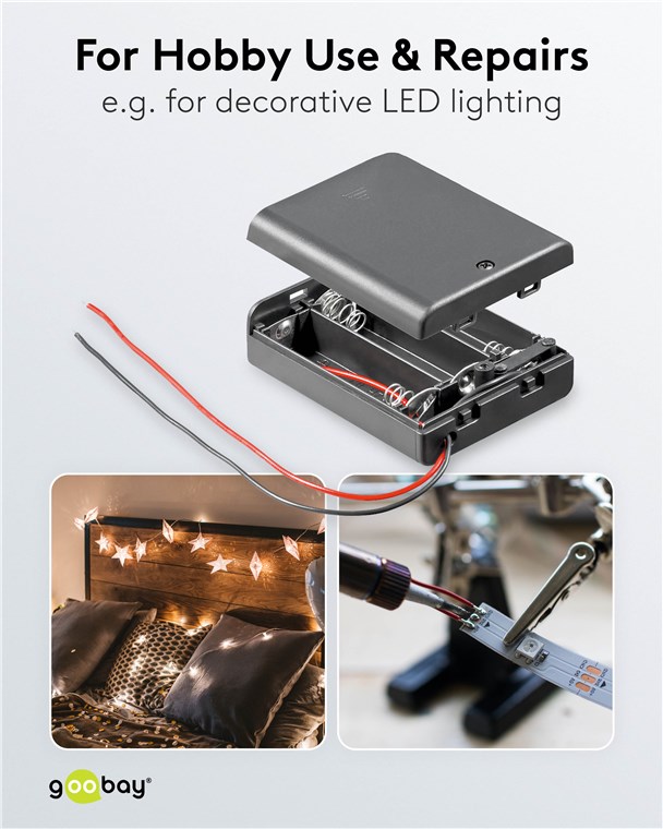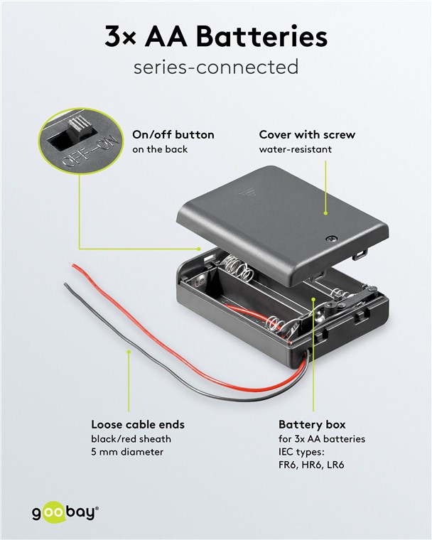 - Die AA-Batteriehalterung ist mit einem Ein- und Aus-Schalter und losen Kabelenden ausgestattet.