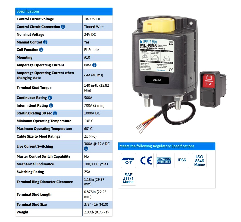 500A Hochleistungsschaltrelais für KFZ / Boot / Caravan usw. Funktion 1x Ein/Aus 500A Dauerstrom 700A Spitzenstrom Relais für 12V Systemspannungen Ideal als 12V Trennrelais zwischen Haupt-, und Zweitbatterie usw. Anschluss des Hauptstromkreises über 2x M10 Gewinde Anschlüsse Bistabiles Hauptschalterrelais mit manueller Betätigung und potentialfreier Schaltung, Schutzart IP 66Temperatureinsatzbereich : -40°C .... + 85°CLieferung mit Steuerschalter ( 2145 ) Included Das bistabile Hauptschalt-Relais mit integrierter Ansteuerelektronik ermöglicht die komfortable ferngesteuerte Ein- und Ausschaltung der angeschlossenen Verbraucher von jeder beliebigen Stelle im Fahrzeug wie KFZ Bus Caravan oder Boot. Die integrierte manuelle Notbetätigung ermöglicht das Ein- und Ausschalten von Hand direkt am Relais. Dieses Relais benötigt zur Steuerung zwei Impulse: 1x zum Einschalten und 1x zum Ausschalten am einfachsten per optionalem Taster oder optionalem Paneltaster Nennspannung: 12V DC Spulenspannung (integrierte Steuerelelektronik) Bei 12V Ansteuerung (9-15VDC) Dauerstrom geleitet: 500A @ 20°C, 95qmm Überlaststrom: max 700A / 5sek. kurzfristiger Spitzenstrom: 1000A / 5sek.Kontakte Einsatz typisch 12V 24V 36V 48V max 64V Stromaufnahme: 1mA Anschlussterminals: M10 Schraubkontakte Kontakte: A + B Hauptstomkreis 500A / 700A * / 1000A *Steuerkreis über Kabellitze ( Anschlussplan siehe weitere Bilder ) Schutzart IP66 Abmessungen: B: 139 x H 95 x T 53 mm ( siehe auch Zeichnung weitere Bilder ) Optionales Zubehör siehe (Zubehör-Register) Dieses Hochleistungsrelais ist wie folgt erhältlich : Bst Nr 47-826-00176 = 12V Ausführung Bst Nr 47-826-00177 = 24V Ausführung