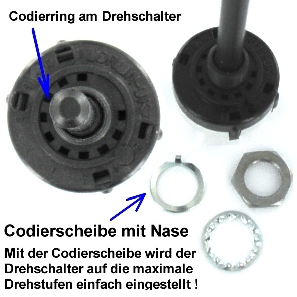 Drehschalter max 6-stufig - einstellbar durch beigelegte Codierscheibe einstellbar auf 2-, 3-, 4-, 5- oder 6-Stufen