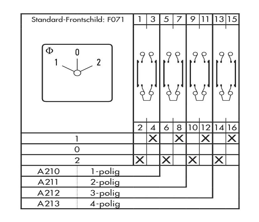 Auflösung Nr CA10 / A = Quadratisches Feld A210 = 60° Schaltwinkel 1-polig / 600E Steht für die Bauform, in diesem Fall meist Frontbefestigung (4-Loch) mit passendem Frontschild.