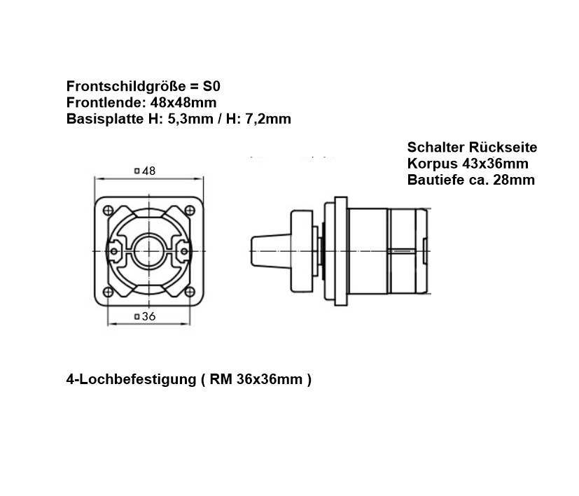 - Frontschildgröße: S0 = Frontlende: 48x48mm / Basisplatte H: 5,3mm/ H: 7,2mm