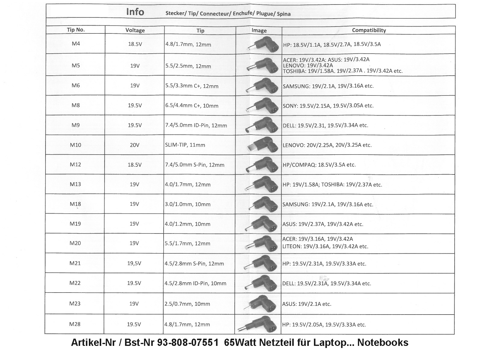 Kompatibel zu allen Notebooks mit 18,5V...19V... 19,5V.. bis..20V Eingang. Universell einfach und Automatische kodierung durch deie Stecker mit Aufdruck