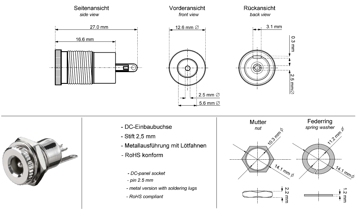 Produktinformationen "5,5x2,5mm Einbau Buchse Hohlstecker Buchse Metallausführung"