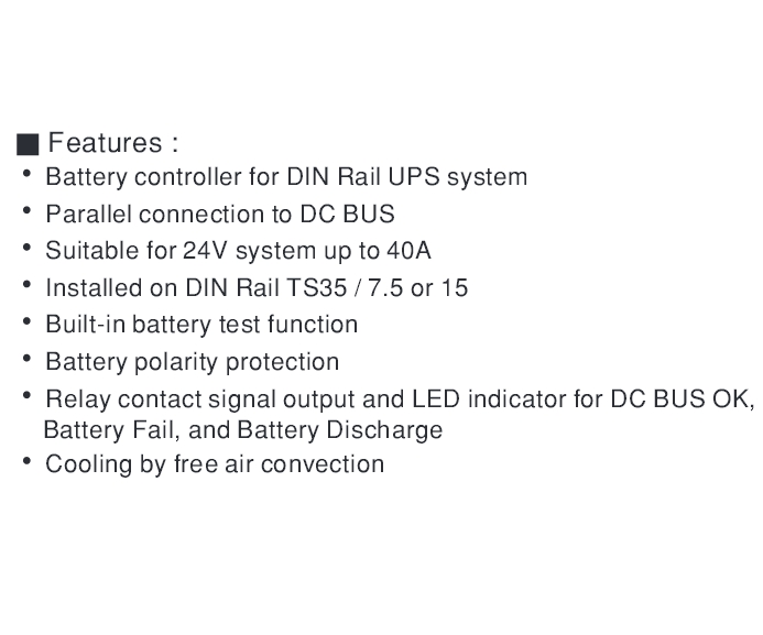 Anschluss einfach parallel zur bestehenden 24V Gleichspannungsversorgung und einem externen optionalen 24V Bleiakku, geeignet für 24V Systeme bis 40A, integrierter Akkutester, Schutz gegen Akkuverpolung, Relaisausgang und LED-Anzeige für DC-Spannungsversorgung o.k., Akku o.k. und Akku entladen.