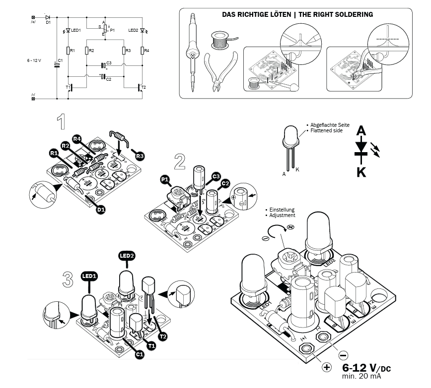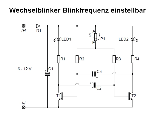 2 verschiedenfarbige Leuchtdioden blinken abwechselnd auf. Die Blinkfolge ist regelbar.