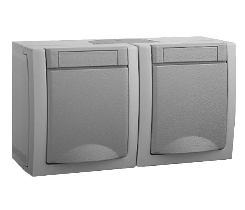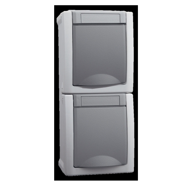 Feuchtraum Aufputzschalter mit Steckdose mit Klappdeckel Typische Anwendung Keller, Garage, Parkhaus, Werkstatt, Treppenaufgänge, Flure, Terasse, Outdoor usw. IP54 Feuchtraumaufputzprogramm welches qualitativ seinesgleichen sucht. Aufputz Schalter mit Schutzkontaktsteckdose 3polig Wippschalter Aus- und Wechselschaltung mit N-Klemme Patentiertes Design: Der Austausch der Oberteile bei gleichbleibenden Unterteil ist jederzeit möglich Durch die Modulbauweise Einsätze von waagerechten und senkrechten Kombinationen austauschbar, Robustes Gehäuse aus glasfaserverstärktem Thermoplast Chemischer und thermischer Beständigkeit ist gewährleistet Schlagfest gem. IK5 Norm mit chemischer und thermischer Beständigkeit, Gehäuse hellgrau - Wippen und Klappdeckel dunkelgrau Einsätze mit Steckklemmen als Verbindungsklemme für den Anschluss von starren Leitern bis 2,5qmm großem Anschlussraum und Durchschleifmöglichkeit Aufnahmemöglichkeit von Beschriftungs-Set Das Basisgehäuse ist fest für 2x Einheiten also Schalter und Steckdose ausgelegt und kann nicht getrennt werden, die Einsätze natürlich schon. Weichmembran-Kabeleinführungen unten und oben Halogenfrei erfüllt alle üblichen Normen IK05 (Hammerschlagfestigkeit für hohe Beanspruchungen ) Schutzgrad IP54 (staub- und spritzwassergeschützt) Schalter = Spannung : 230VAC Nennstrom typisch bis 10A Steckdose = Spannung : 230VAC Nennstrom typisch bis 16A Abmessungen: H: 163mm B: 74mm T: 56mm Deckel = B: 56mm H: 61mm Beschriftungsfeld: 40x10mm