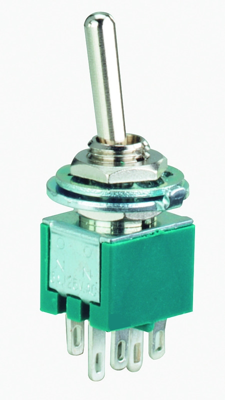 Miniatur-Kippschalter mit Metallknebel und Isolierkappe. Belastbarkeit: bis 3A 250VAC oder 6A 125VAC Lötkontakte 6polig 2x Wechslerkontakte = 2xUM Abmessungen: H:35mm mit Hebel und Kontakten Korpus: 13 x 13mm Hebellänge ca. 11mm mit Kappe 13mm Gewinde: 6mm / Bohrung Frontplatte 6,2mm Gewindelänge ca. 8,8mm
