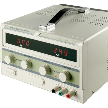 Digitales Doppel Labornetzgerät 2x 0-30V / 2x 0-5A und 5V DC 3A fest Ein völlig neu konzipiertes linear geregeltes Labornetzgerät im modernem Design und neuester Technologie, mit 3-stelligen 14 mm blauen LED-Anzeigen für die Spannungs- und Stromwerte, die eine schnelle und präzise Ablesung ermöglichen. Ausgestattet mit stufenlos regelbarer Spannungsausgabe; die Konstantspannung und der Konstantstrom sind automatisch wählbar und fernerhin kann der Strombegrenzungschutz beliebig eingestellt werden. Im Konstantstrom-Modus ist der Ausgangsstrom stufenlos einstellbar und verfügt dieses Gerät über 2 Ausgänge mit kontinuierlich veränderbarer Ausgangsspannung bzw. Ausgangsstrom und kann wahlweise in Reihe oder Parallel geschaltet werden. Somit beträgt bei in Reihe geschalteten Ausgängen die max. Ausgangsspannung 60 V DC; bei parallel geschalteten Ausgängen verdoppelt sich der max. Ausgangsstrom auf 10A DC. 4 mm Sicherheitsbuchsen Ausgänge abschaltbar Die Ausgangsspannung bzw. Ausgangsstrom sind auf zwei getrennten LED-Anzeigen ablesbar Überlastschutz und kurzschlussfest Die Festspannungsausgänge von 5 V/3 A verfügen über eine hohe Stabilität und einen geringen Brummfaktor Sicherheit: EN 61010-1 Safety-Transformer: EN 61558 - 2 - 6 Zubehör: Netzkabel und Bedienungsanleitung Ausgangsspannung 2 x 0 - 30V regelbar Ausgangsstrom 0 - 5A DC regelbar Ausgangsleistung 2 x 150Watt max Restwelligkeit (U) nur 1mV eff !! Restwelligkeit (I) nur 3mA eff !! Betriebsspannung 115 V / 230 V AC, 50/60 Hz Abmessungen (BxHxT) 265 x 170 x 355 mm Gewicht 11 kg