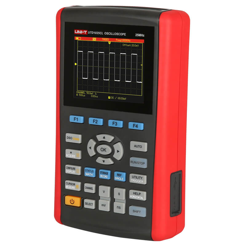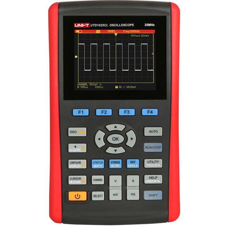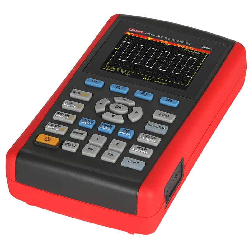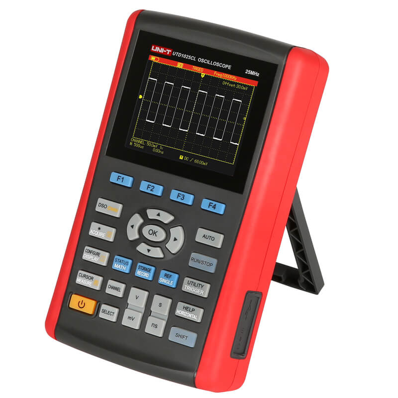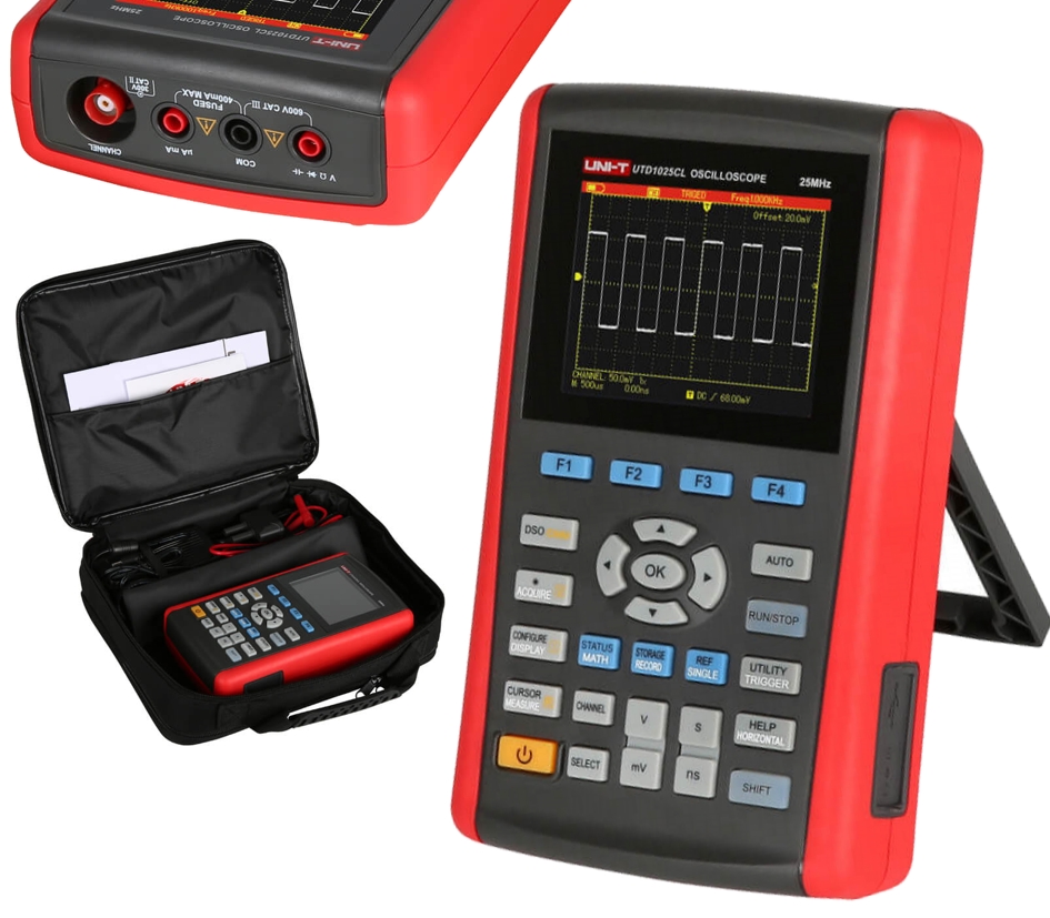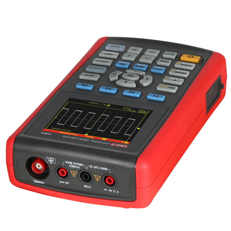 Das tragbare Oszilloskop ist ein hochwertiges, tragbares Digital-Speicheroszilloskop, welches die Funktionalität eines 1-Kanal Digital-Oszilloskops mit einer Analogbandbreite von 25-MHz und einer Samplingrate von 200 MS/s mit der eines Digitalmultimeters verbindet.