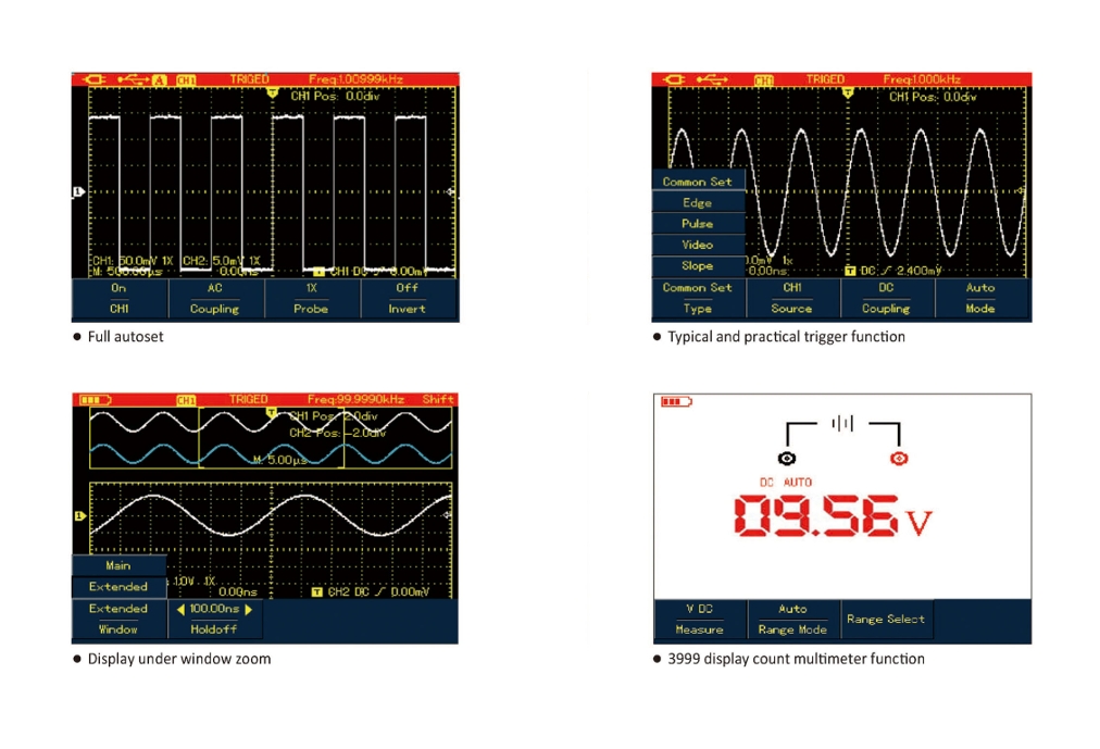 Das Gerät kann mit dem eingebautem Akku oder mit einem Netzteil betrieben werden. Durch den großen Funktionsumfang sowie den attraktiven Preis, ist das Digital-Oszilloskop sehr beliebt bei Ingenieuren und anderen professionellen Anwendern. Das Gerät erfüllt alle EU-Sicherheitsnormen.